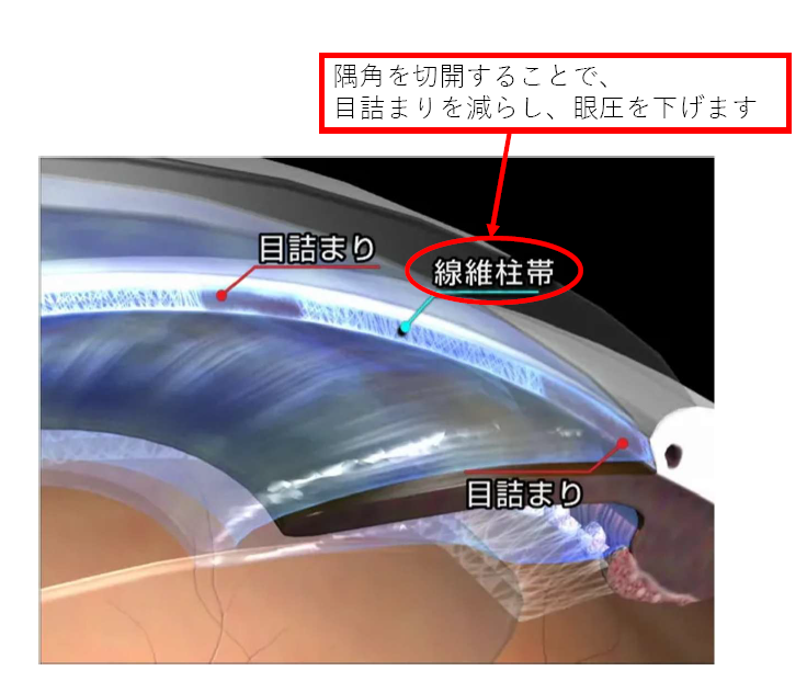 また、この病型にも点眼治療が有効ですが、最終的には白内障手術にて閉塞した隅角を開大させる治療が必要になる場合があります。