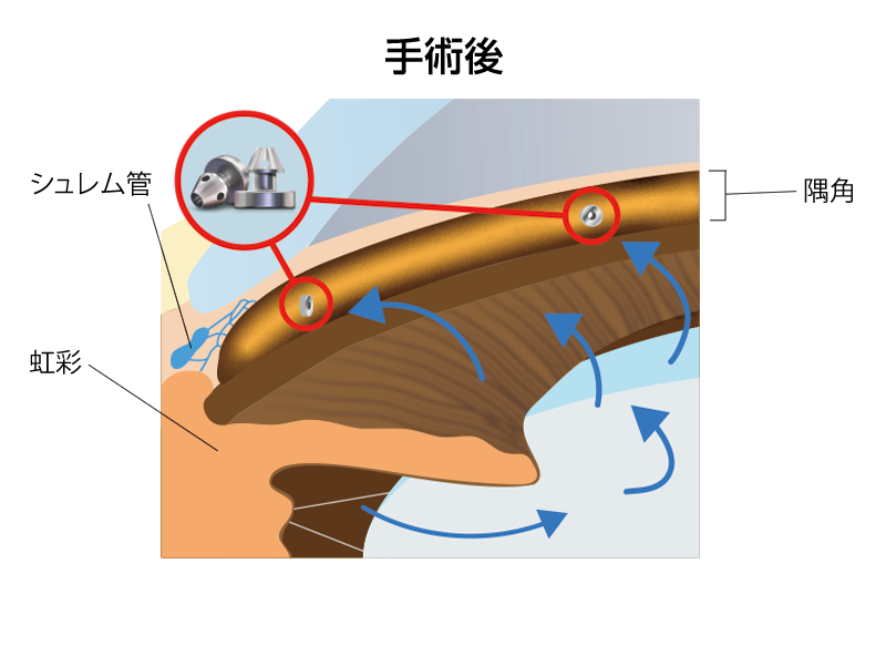 以上の治療でも眼圧が十分に下がらず視野障害が進行する場合、手術にて眼圧下降を行います。代表的な術式に流出路再建術または濾過手術があり、本院ではいずれも日帰りで施行しています。
