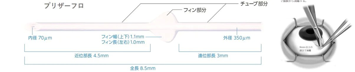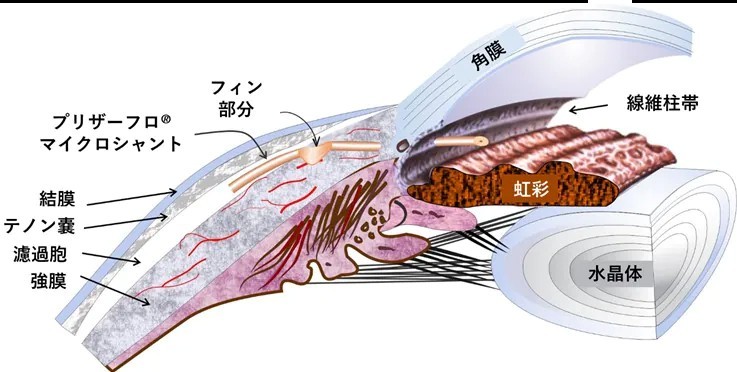 主に難治性緑内障の方に行われます。濾過胞が後方にできるため、線維柱帯切除術で生じる濾過胞のトラブルが生じにくいとされています。眼圧が低くなりすぎないように弁がついているため、低眼圧になりにくく、安定した術後経過が得られます。前房内にチューブを留置する方法と硝子体腔にチューブを留置する方法が報告されています。前房内にチューブを留置した場合角膜内皮が減少すると報告されているため、当院では硝子体腔にチューブを留置する方法で施行しております。
